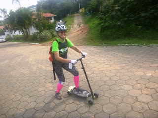Depois de vencido o medo e ter conseguido estancar o sangue, corremos pela praia. Com todos esses contratempo que aconteceram eu pensava que a nossa meta de classificação já era. Vamos curtir a prova. Voltamos para a pousada e pegamos o patinete para percorrer 5 km. Como só tinha um patinete a Cristina se mandou com ele, enquanto nós três fomos correndo.